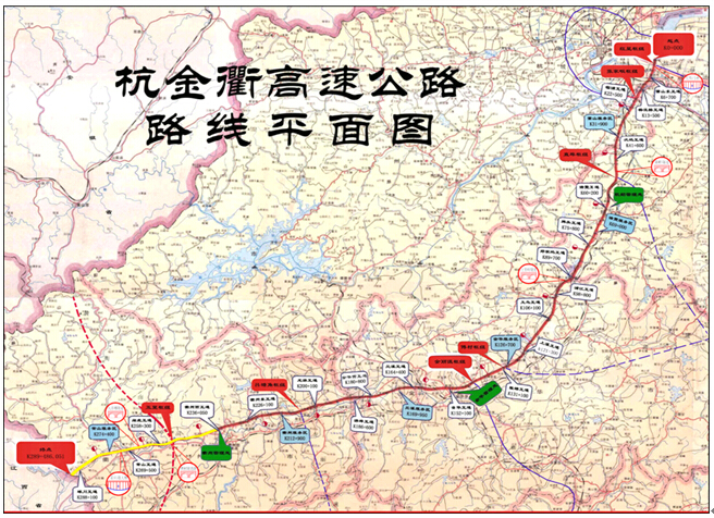 杭金衢高速公路是國家規(guī)劃中的國道主干線"五縱七橫"之一,北起浙江蕭山,南至浙贛交界處的常山窯上,全長290km,是浙江穿越縣市最多的高速公路。其中,蕭山紅墾至蕭山下浦許采用雙向六車道,路基寬度34.5m,下浦許至衢州東采用雙向四車道,路基寬度為28m;衢州東至翁梅路基寬度為26m。全線實(shí)行全封閉、全立交。