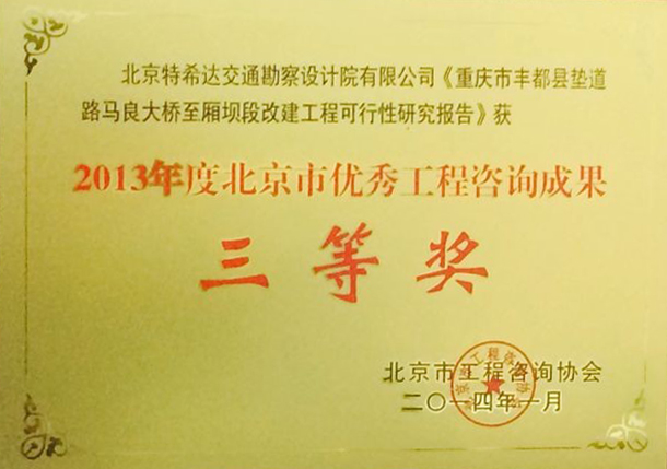 榮獲北京市工程咨詢協(xié)會頒發(fā)的《重慶市豐都縣墊道路馬良大橋至廂壩段改建工程可行性研究報告》2013年度北京市優(yōu)秀工程咨詢成果三等獎