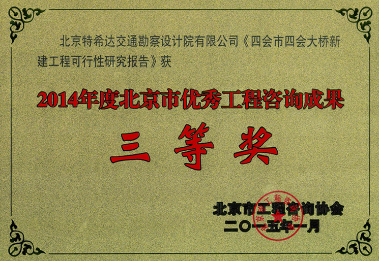 榮獲北京市工程咨詢協(xié)會頒發(fā)的《四會市四會大橋新建工程可行性研究報告》2014年度北京市優(yōu)秀工程咨詢成果三等獎